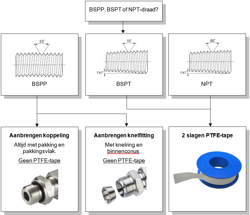 - Controleer op lekkage: Na het in bedrijf nemen van de verbinding is het belangrijk om een grondige controle op lekkage uit te voeren. Controleer visueel of er lekkagesporen zijn rondom de schroefdraadverbinding. Let ook op eventuele drukverlies of andere indicaties van lekkage. Als er lekkages worden gedetecteerd, moeten de nodige maatregelen worden genomen om de verbinding te repareren of aan te passen.