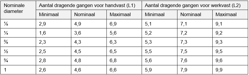 - Draai de componenten “werkvast” aan met geschikt gereedschap: Gebruik een geschikt passend gereedschap om de componenten verder aan te draaien tot de vereiste werkvaste positie. Tijdens het verschroeven, tel opnieuw het aantal gangen dat wordt gedraaid. Het totaal aantal dragende gangen, inclusief de gangen voor “handvast”, moet binnen het bereik liggen dat wordt aangegeven in de onderstaande tabel.
