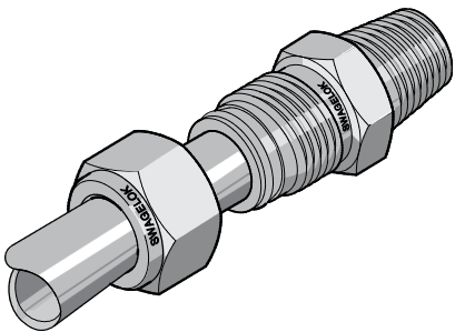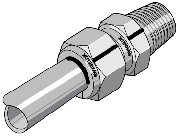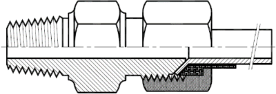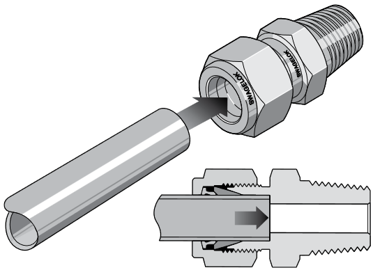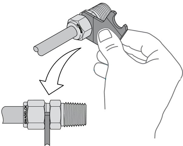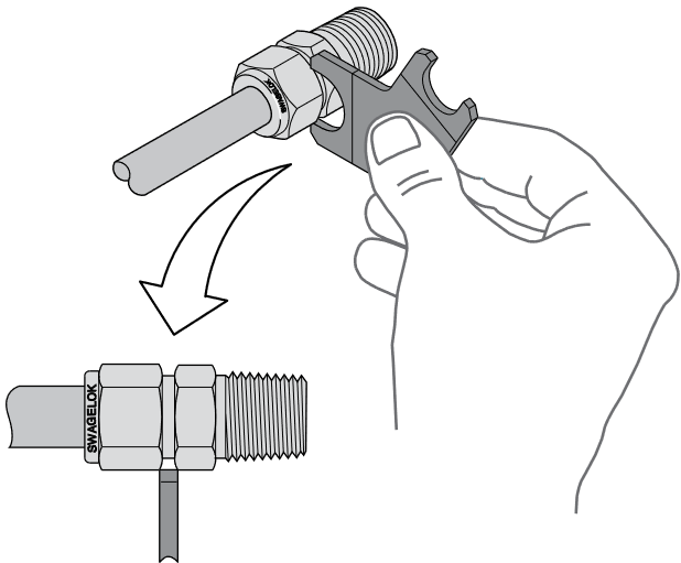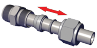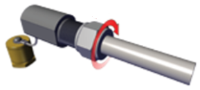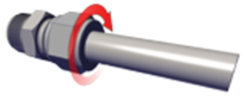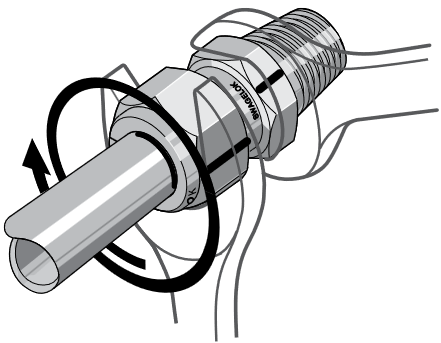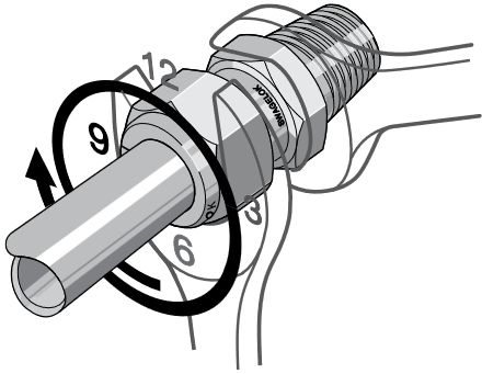 - Steek de buis volledig in de fitting en tegen de schouder. Draai de moer handvast. Bij hoge-druktoepassingen en systemen met een hoge veiligheidsfactor: Draai de moer verder aan totdat de buis niet meer met de hand draait of axiaal beweegt in de fitting.