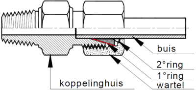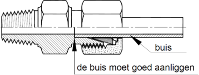 Bij het gebruik van koppelingen met oppervlakteklemming wordt de buis ongeveer 0,6 mm in de koppeling getrokken. Als het niet mogelijk is om de buis volledig in de koppeling te plaatsen, zoals weergegeven in de afbeelding, zal de buis altijd onder spanning gemonteerd worden.