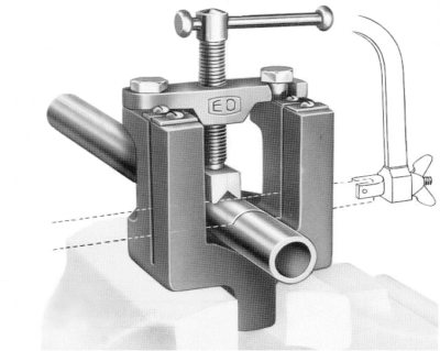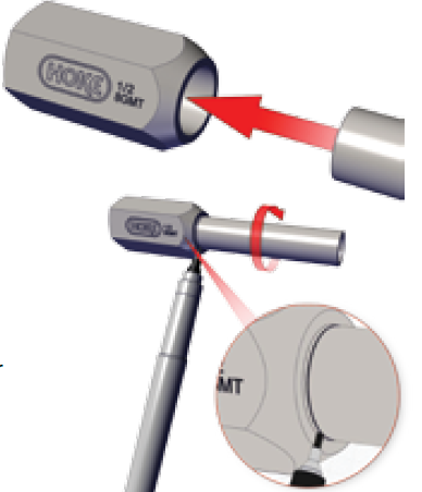 - Vanuit deze positie moet de wartel met behulp van twee sleutels teruggebracht worden naar de originele 9-uur positie. Afhankelijk van de veerkracht van de gebruikte buis is doorgaans een draai van ongeveer 1/8 nodig.