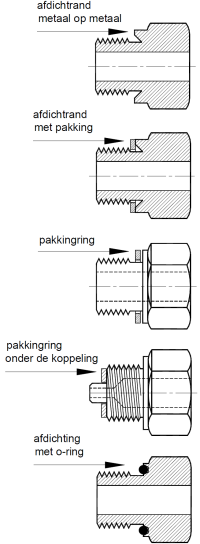 Zie voor een samenstellingsvoorbeeld onder vlakafdichting eerder in deze cursus. Voor montage is het van het grootste belang dat de koppeling schoon is. Alle vlakken, schroefdraden, drukringen en eventuele pakkingen zoals O-ringen moeten schoon zijn. Fabrikanten schrijven vaak smeermiddelen voor die afhankelijk van grootte van de koppeling en hoogte van de heersende druk een bepaalde samenstelling en viscositeit moet hebben.
