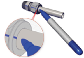 - Smeer de “male” en “female” draad dun in: Breng een dun laagje SWAK® pasta of Liquid-O-Ring® 404 Syn aan op zowel de mannelijke als de vrouwelijke draad. Raadpleeg de instructies van de fabrikant voor de juiste toepassing en hoeveelheid.