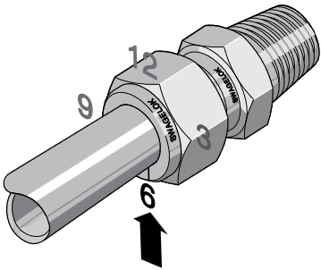 - Terwijl je de koppeling stevig vasthoudt, draai je de moer 1 1/4 slag aan tot de 9-uur positie. Voor buisfittingen van 1/16, 1/8 en 3/16 inch (2, 3 en 4 mm): Draai de moer driekwart slag naar de 3-uur positie.